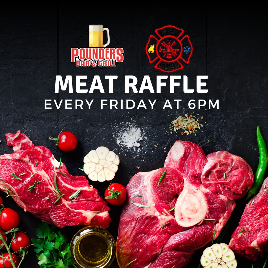 Join us every Friday at 6PM for Meat Raffle! 8-10 rounds with 30 - $1 tickets. Chances of winning a meat package of your choice and/or a free drink!